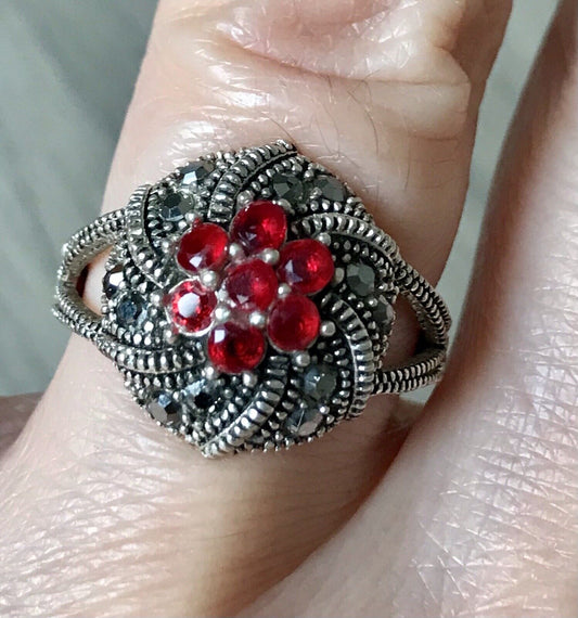 Alt antikisiert Damen Ring Silber 925 SUPER rote Steine Markasite Gr.55