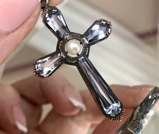 Antik Edel Art Déco Silber Kreuz Anhänger Kettenanhänger blaue Steine Aquamarin?