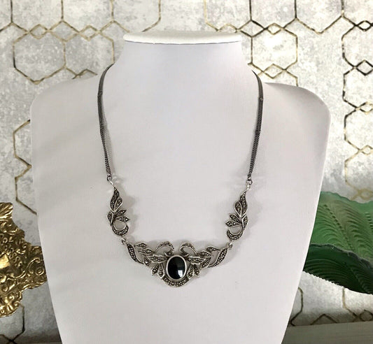Antik Edel Jugendstil Art Déco 925 Silber Collier Halskette mit Onyx & Markasite