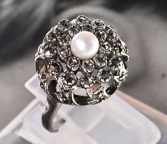 Antik Edel DAMEN Entourage RING Silber 835 Perle Markasite Gr.52