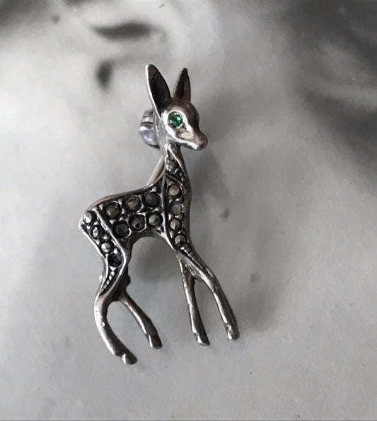 Antik Art Déco Edel Brosche Silber 835 Markasite Rehkitz Grüne Augen