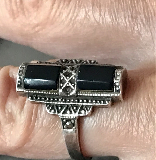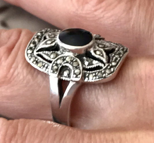 Antik Art Déco Damen Schiffchen Ring Onyx 925 Silber Gr.56 Markasite 18,1