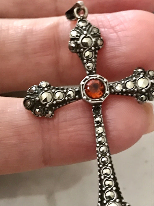 Antik Art Déco Silber Kreuz Anhänger Kettenanhänger rubinroter Stein Markasite