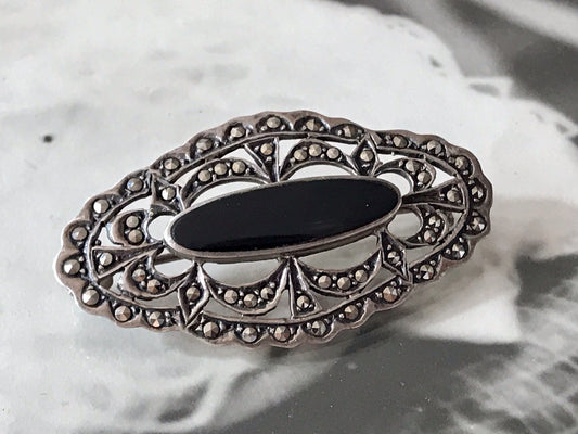 Antik Art Déco Edel Silber 925er Markasiten Onyx Edel Brosche