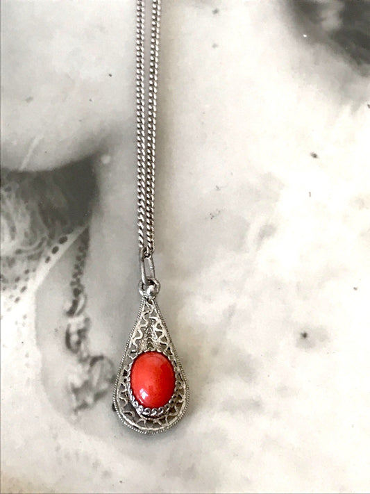 Antik alt 835 Silber filigrane Halskette Koralle? roter Stein