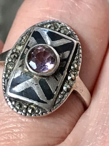 Antik Art Déco Nielo Amethyst Markasite DAMEN RING Silber 925 Gr.54 Schiffchen