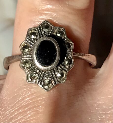Antik Art Déco Edel Onyx Markasite DAMEN RING Silber 925 Gr.58