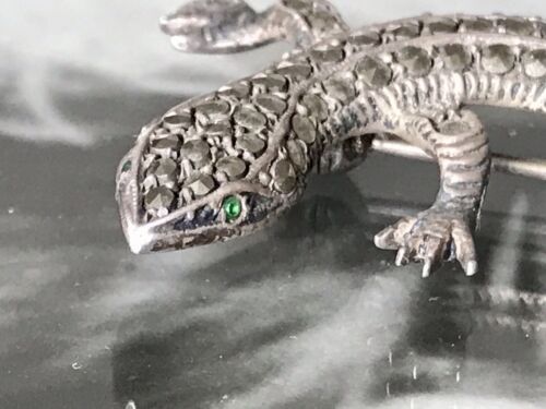 Antik Art Déco Edel prachtvoll Brosche Silber 835 Markasite Eidechse Grüne Augen