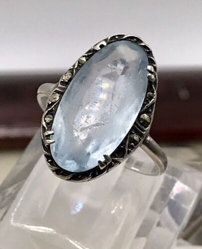 Antik Art Déco Edel hell blauer Stein & Markasite DAMEN RING Silber 935 Gr.52