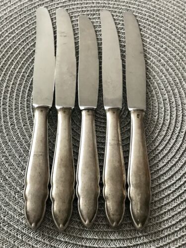 Antik ? 5x Art Déco versilbert Tafelmesser Menümesser Messer Besteck geschweift