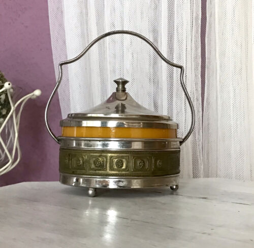 Antik Art Déco Glasdose Glas Deckeldose Bonboniere Glaseinsatz Messing-Relief
