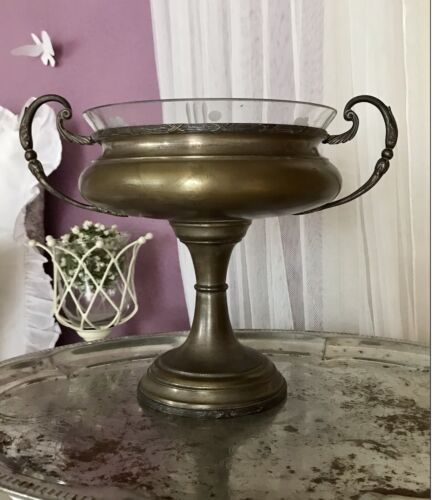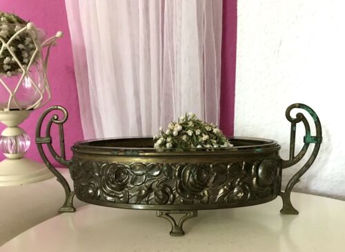 Antik Jugendstil Schale Jardiniere Tafelaufsatz Metallmontur Messingblech Glas
