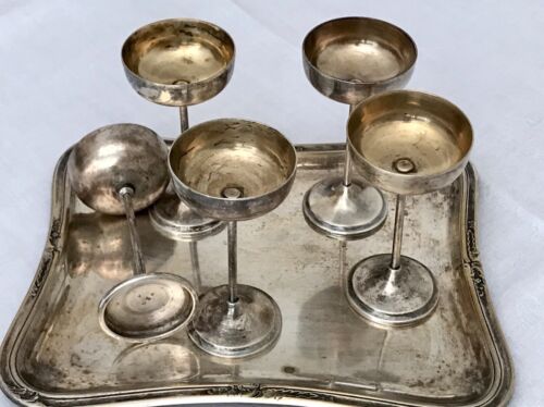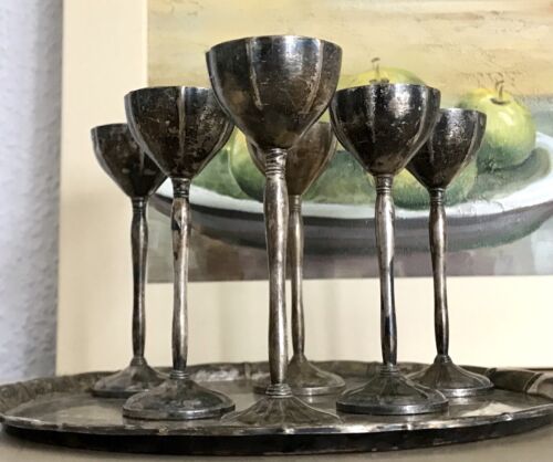 Antik WMF Likör Set versilbert 5 Likörbecher & Tablett Straussenmarke Jugendstil