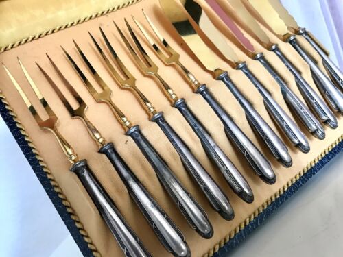 Antik WMF Jugendstil versilbert Obst-Besteck Kreuzband Straussenmarke vergoldet