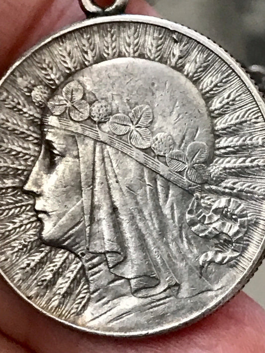 Antik Halskette Münze Jadwiga Polen 1933 Anhänger Kettenanhänger Silber 835