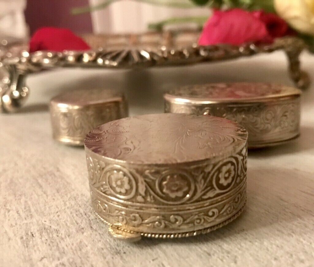 Kommodengriff präsentiert 3 hübsche gut erhaltene alte versilberte kleine Pillendöschen