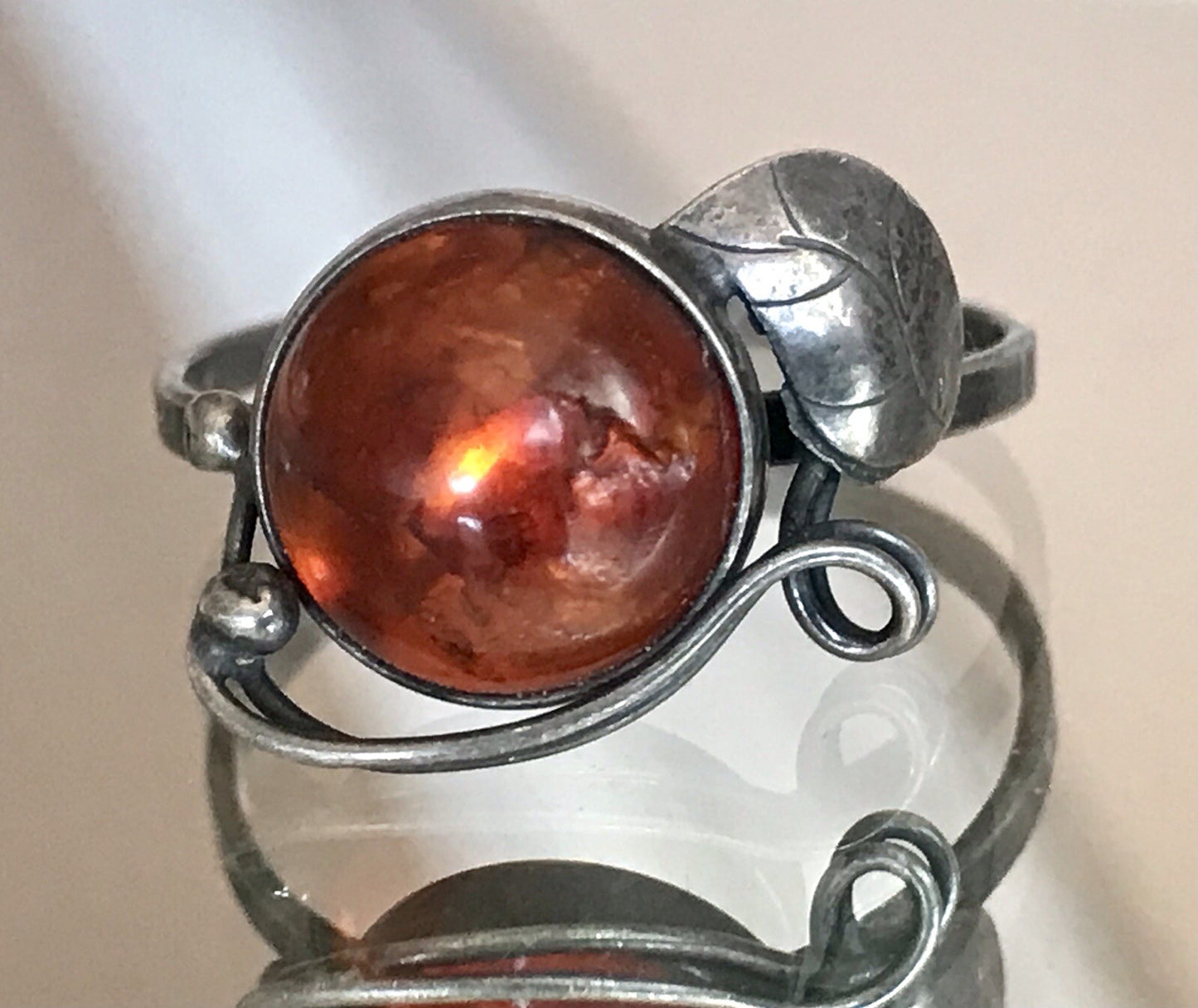 Sehr schönes elegantes wundervolles einmaliges Jugendstil-Design mit halbhohem runden Ringkopf, gefasst in Zargenfassung mit einem runden Bernstein-Cabochon, mit floral stilisierten Fassung mit Blüten und geschweiften Stängeln um den Bernstein umrandet.