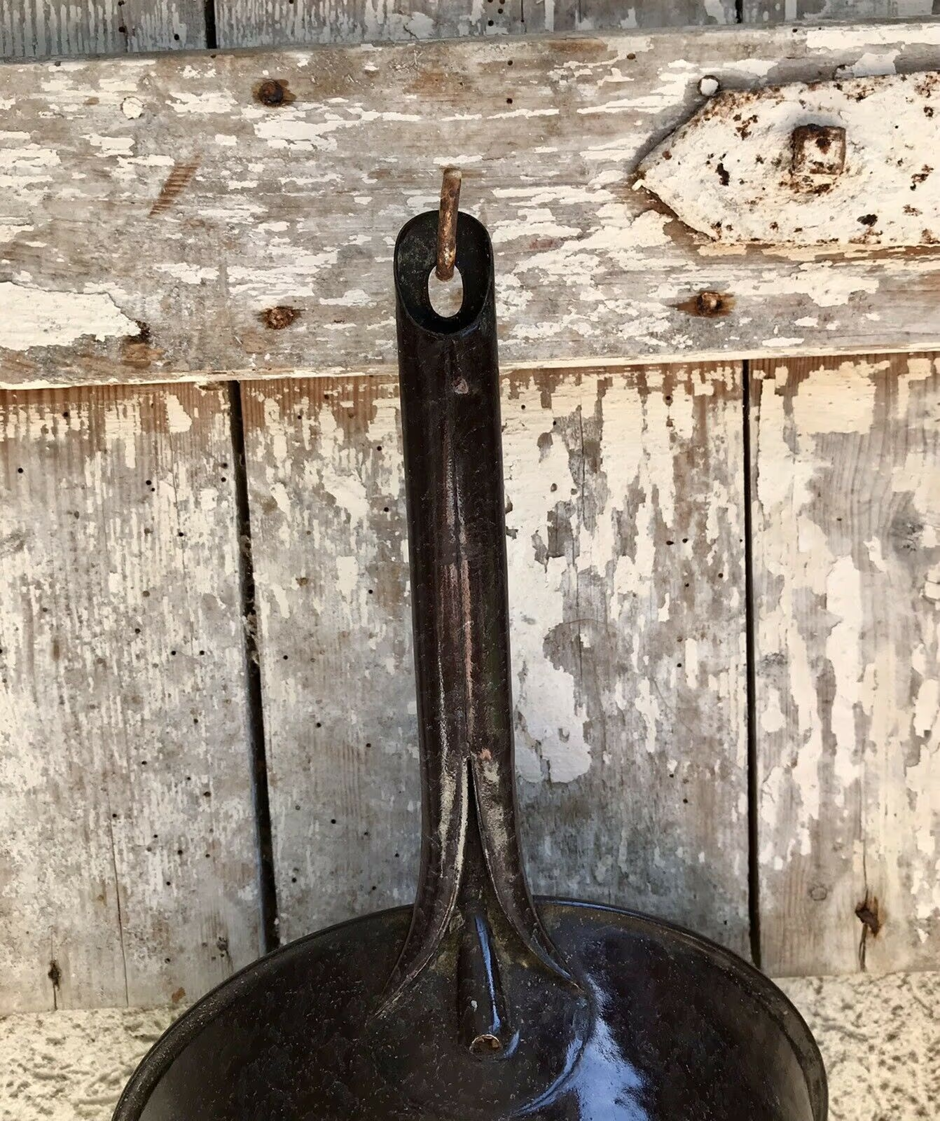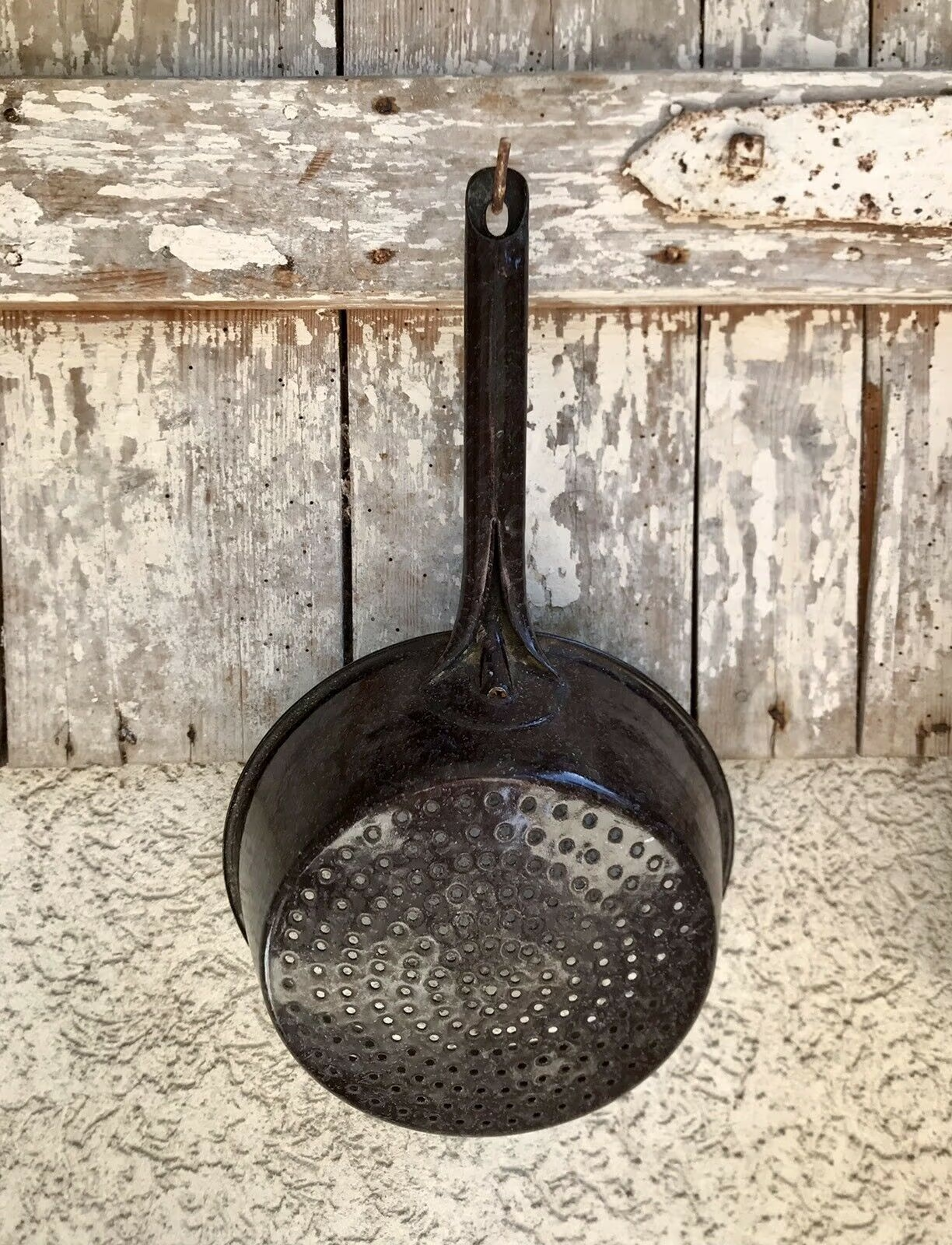 Kommodengriff präsentiert 1 emaillierten dekorativen alten oder antiken braunen Durchschlag Sieb Seiher mit Stiel