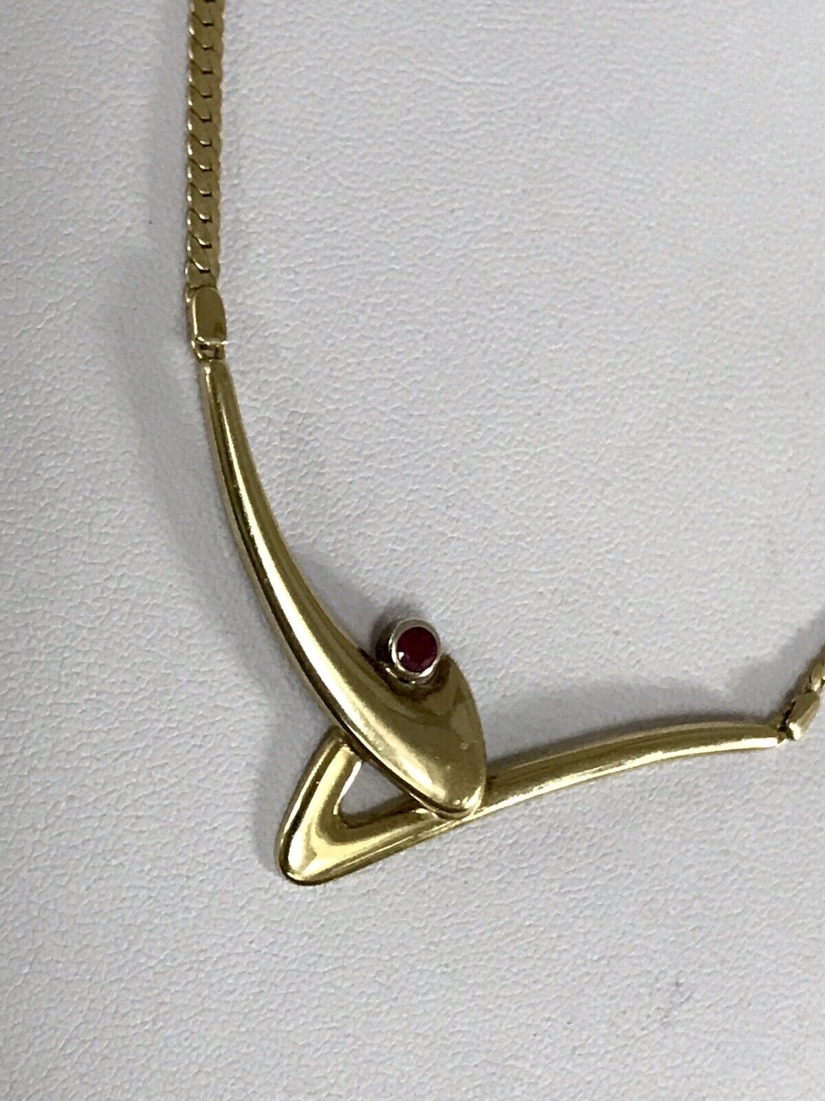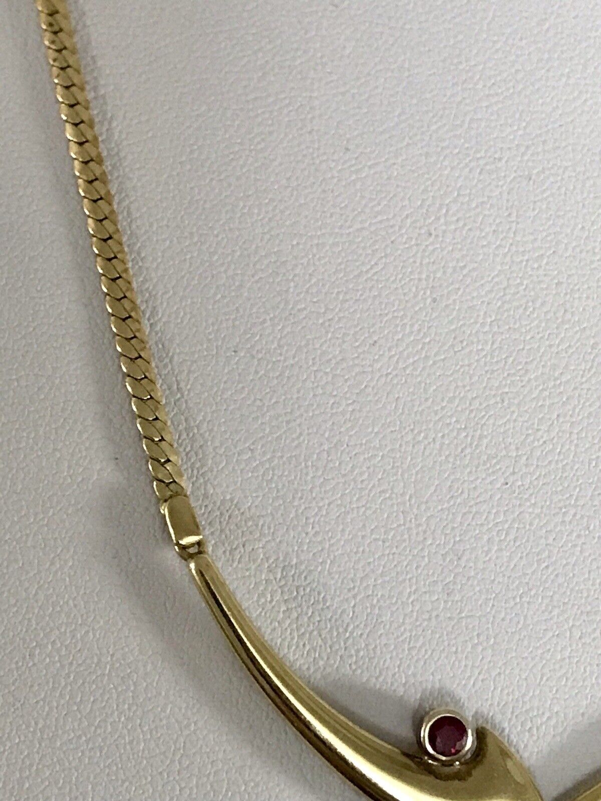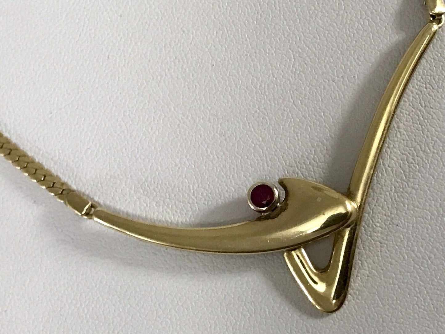 Kommodengriff präsentiert ein altes zauberhaftes entzückendes traumhaft schönes und elegantes Vintage vergoldetes Collier Halskette besetzt mit einem rubinroten Stein