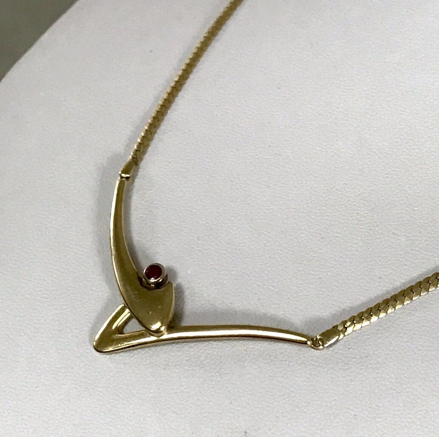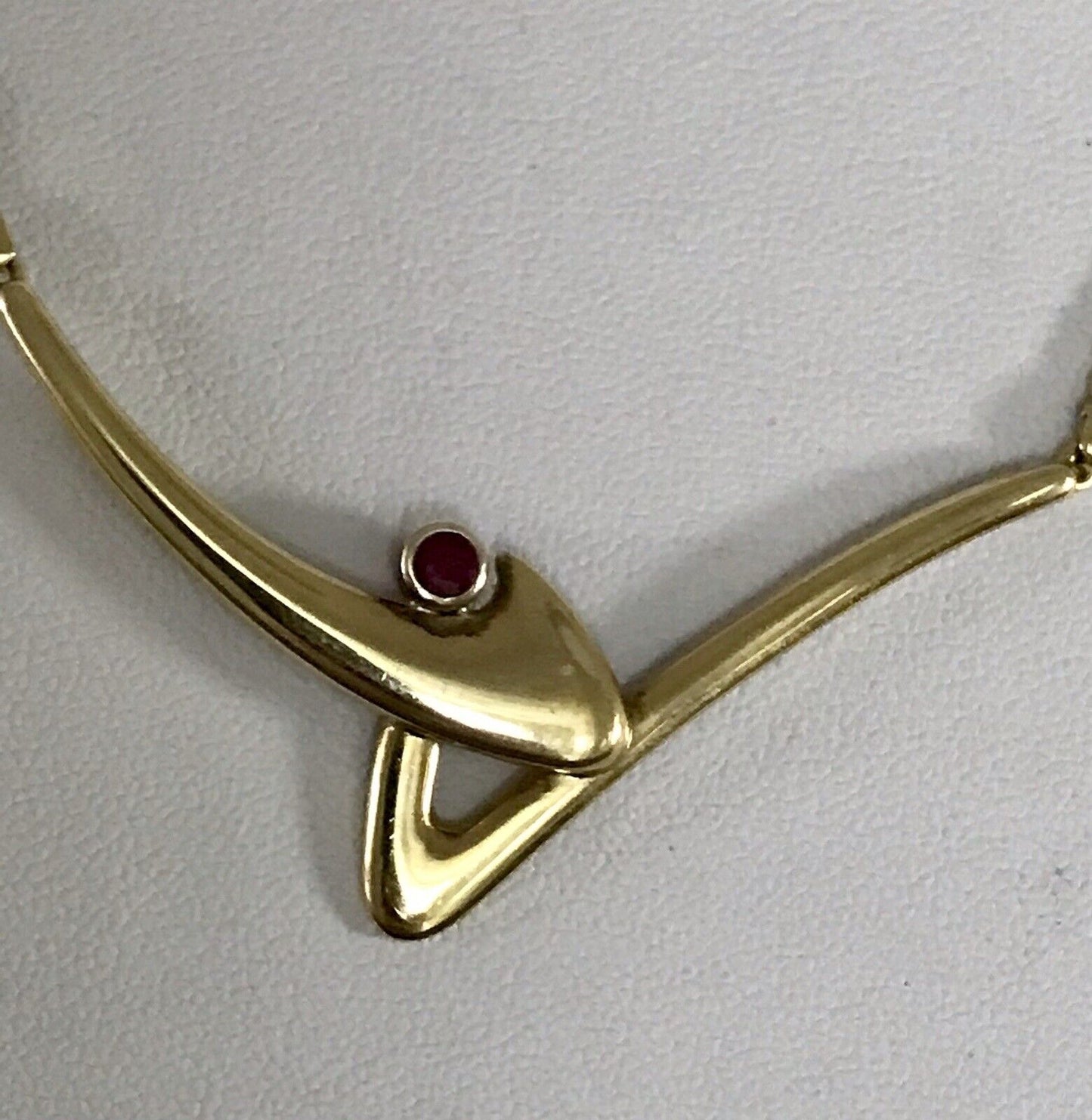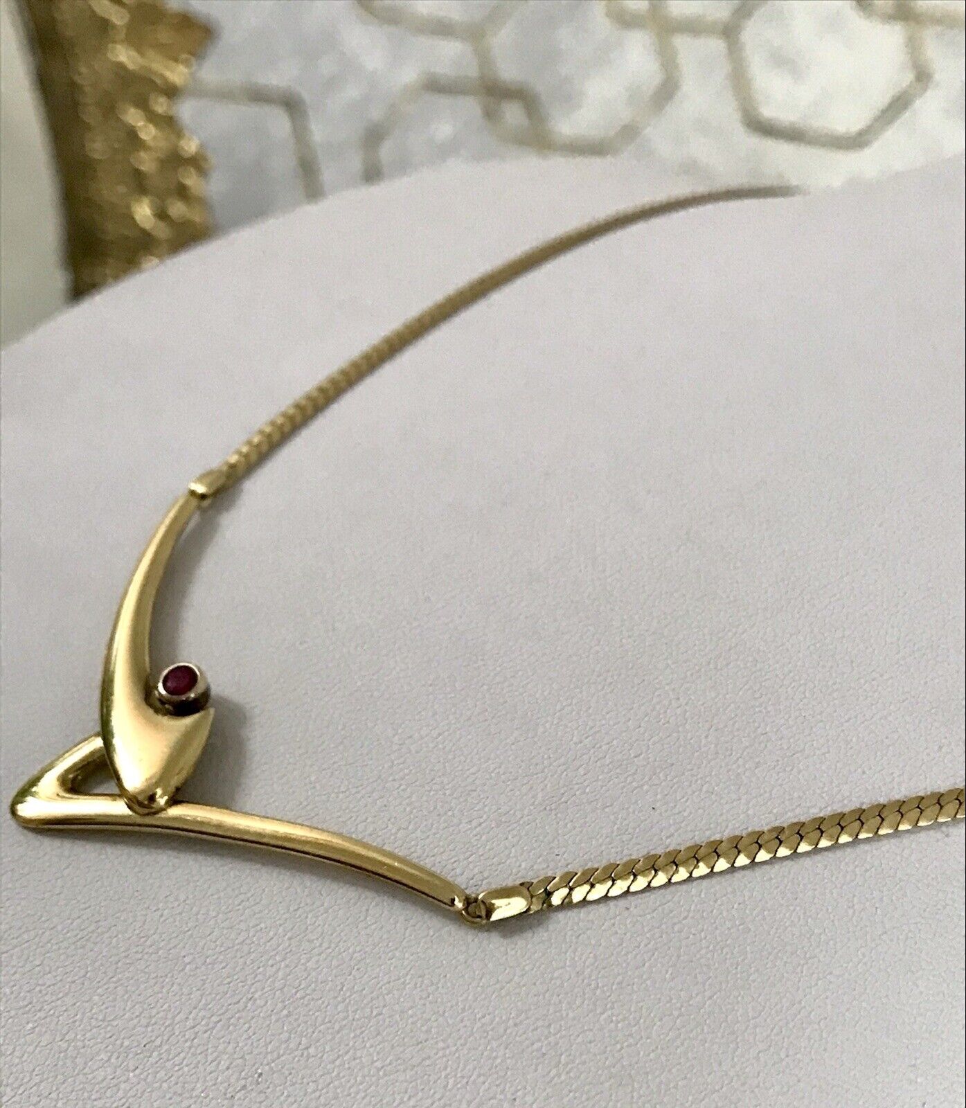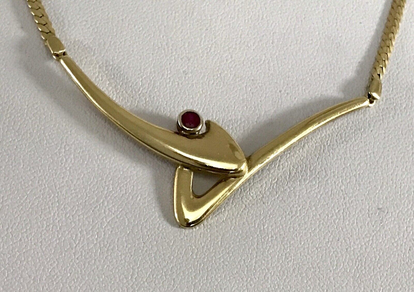 Kommodengriff präsentiert ein altes zauberhaftes entzückendes traumhaft schönes und elegantes Vintage vergoldetes Collier Halskette besetzt mit einem rubinroten Stein