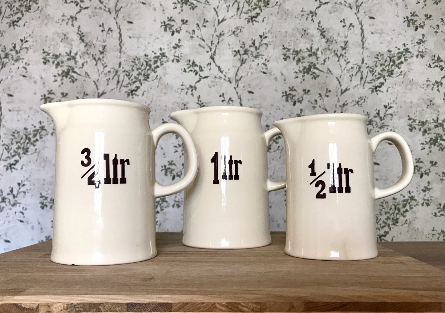 Alt Vintage 3 Kanne Milchkanne Messkrüge DDR Keramik Landhaus creme beige braun 1l 3/4l 1/2l