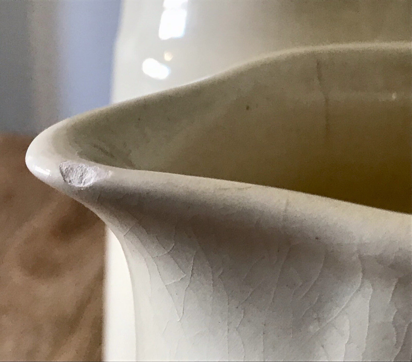 - 1/2 l mit 2 kurzen Haarrissen der Glasur und 1 kleinen Bestoßung am Ausgussrand.