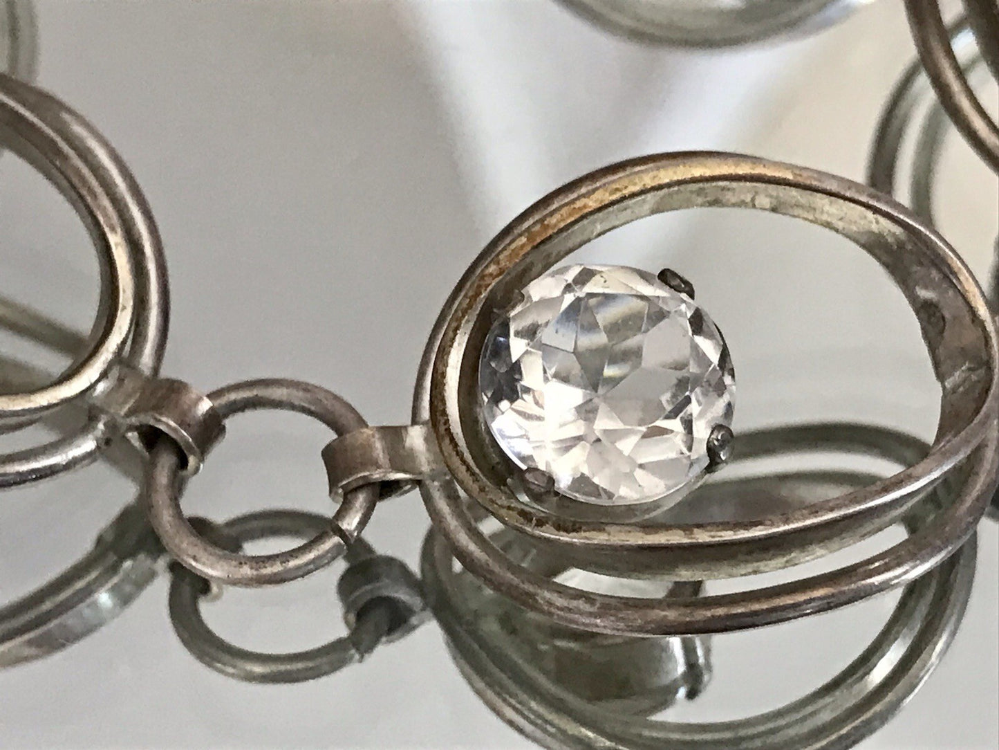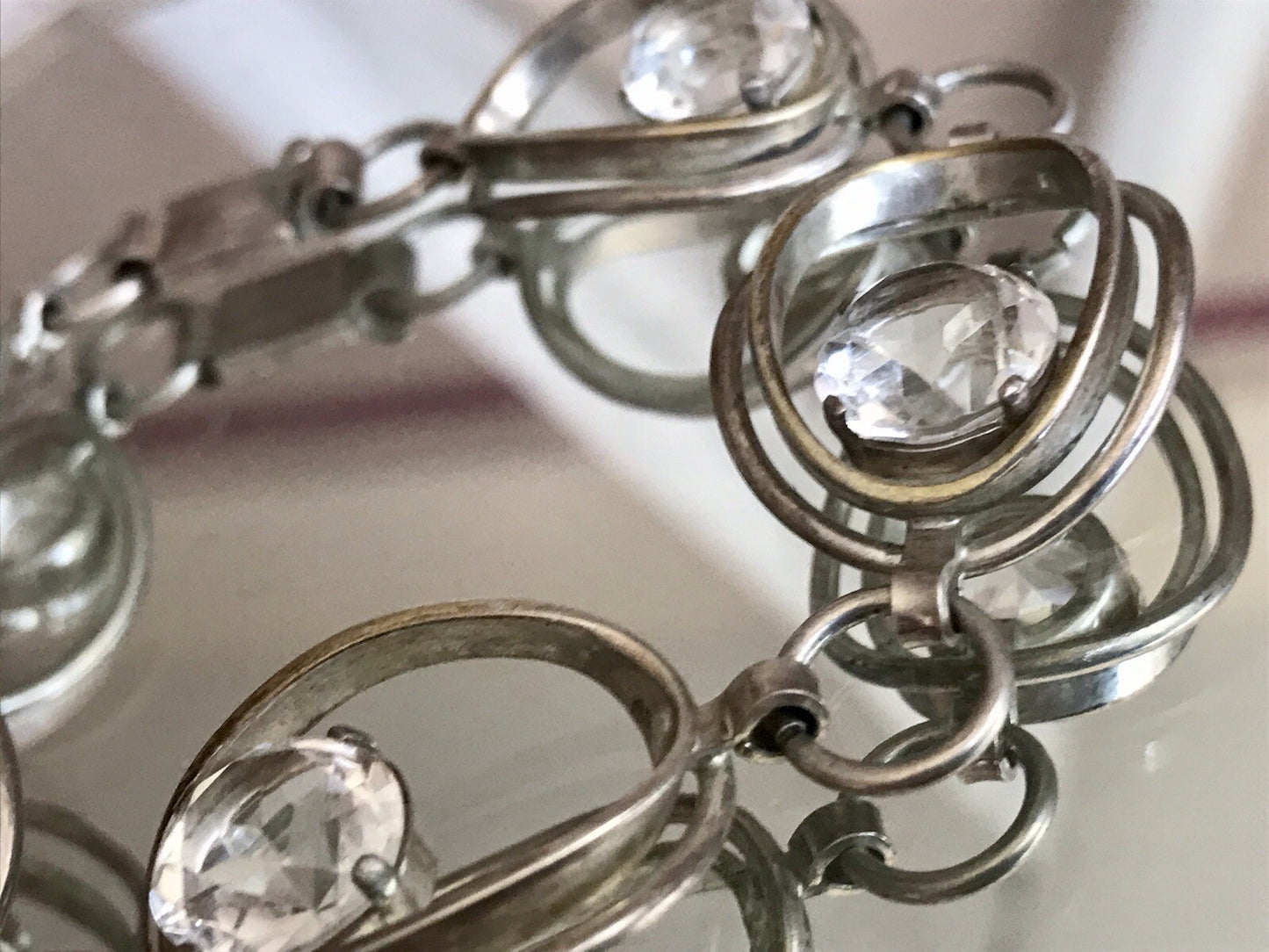 Kommodengriff präsentiert ein zauberhaftes altes Vintage wundervolles Designer-Silber-Armband mit farblosen Steinen