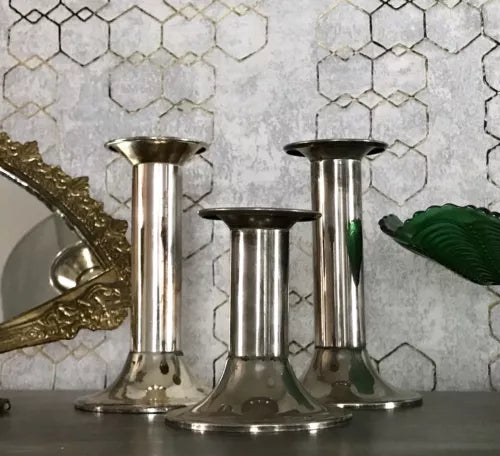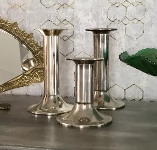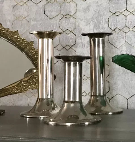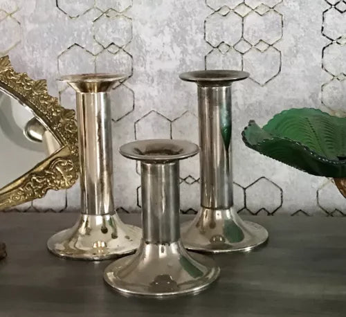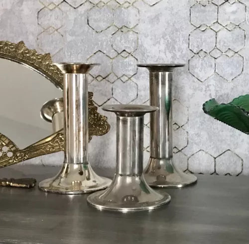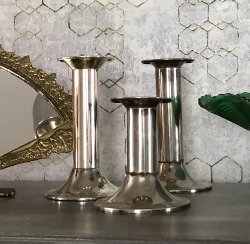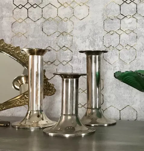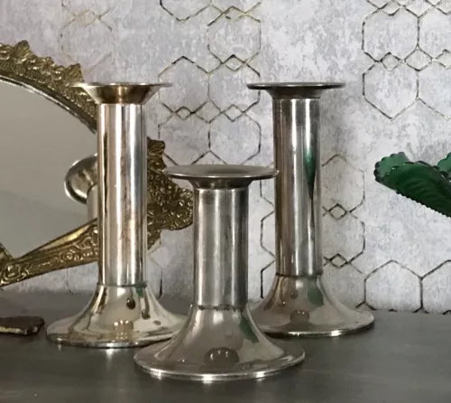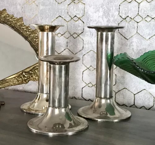Kommodengriff präsentiert 3 wunderschöne ältere versilberte Kerzenleuchter Kerzenständer Leuchter in Art Déco Stil gearbeitet