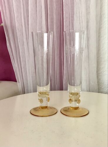 Alte 2 Sektflöten Sektglas Theresienthal EDEL Glas Nuppen Weindekor gelber Stiel