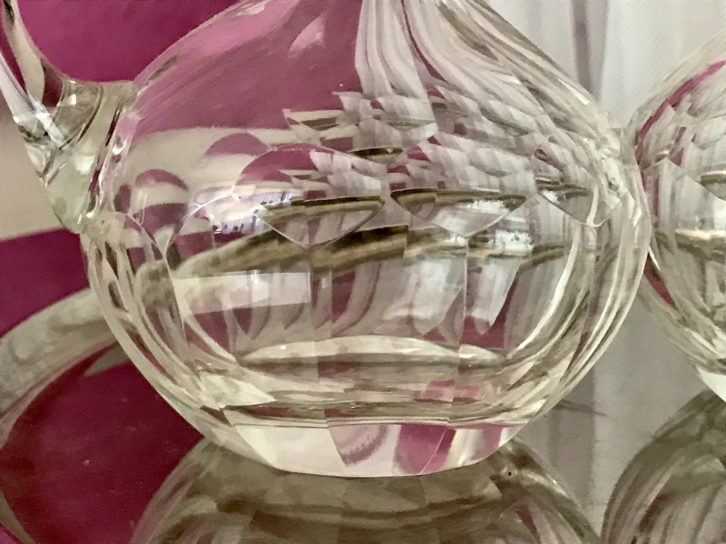 Die wundervolle Karaffe ist aus wunderschönem mundgeblasenen brillanten eleganten farblosen Glas vermutlich sogar aus Kristallglas gefertigt und wundervoll geschliffen, allerdings sind beide Stopfen nicht geschliffen oder nachpoliert.