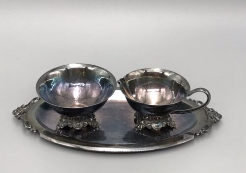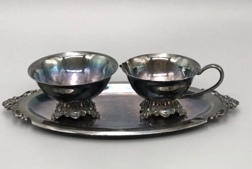 Kommodengriff präsentiert einen entzückenden wunderschönen antiken ? 3 teiligen versilberten Sahne-Satz Milch&Zucker Zuckerschale& Sahnegießer mit ovalem Tablett