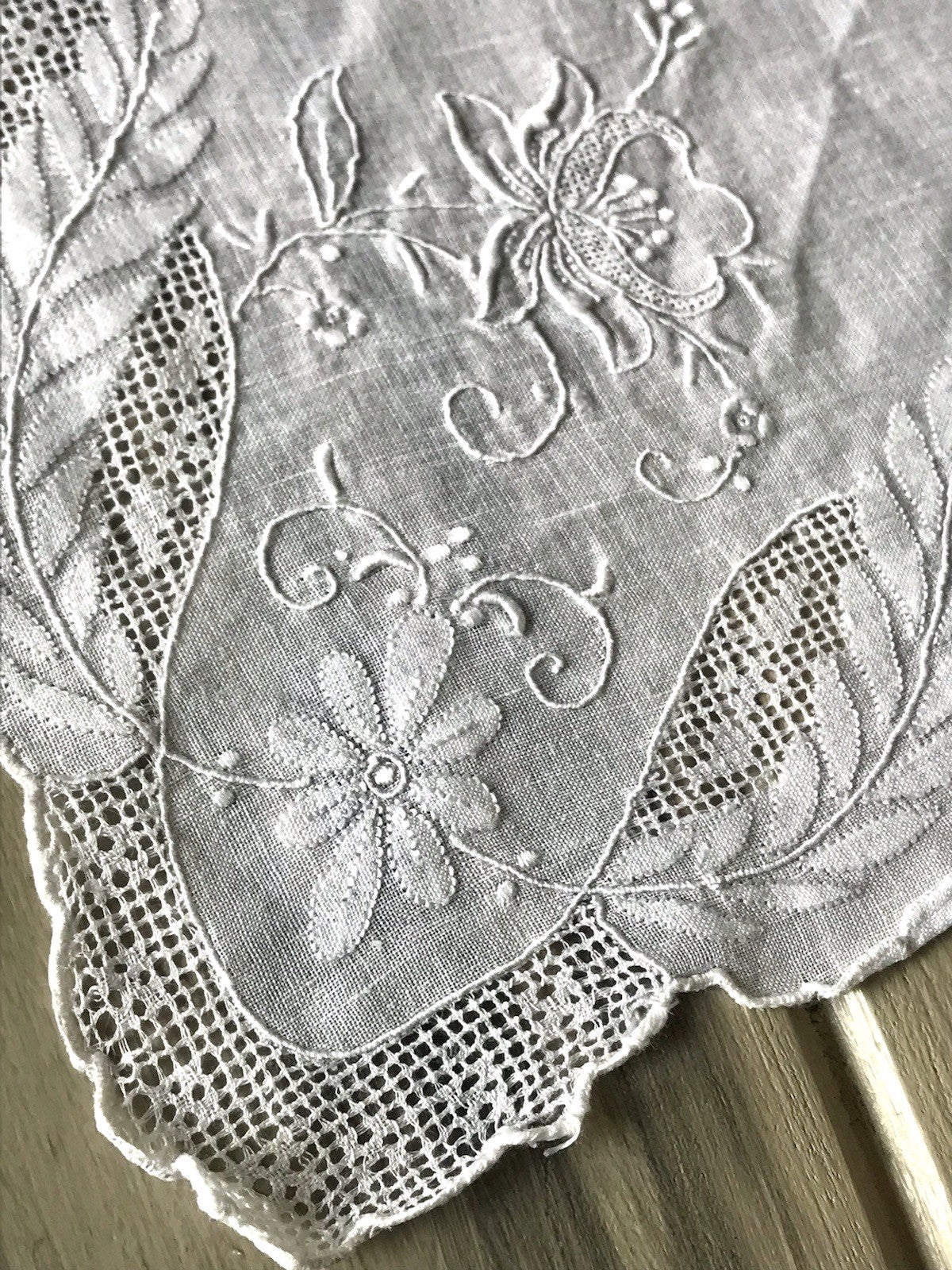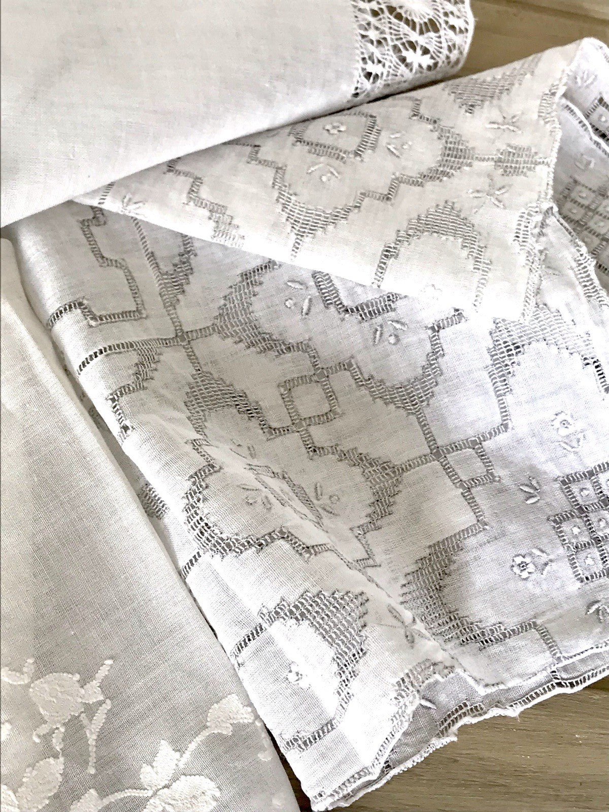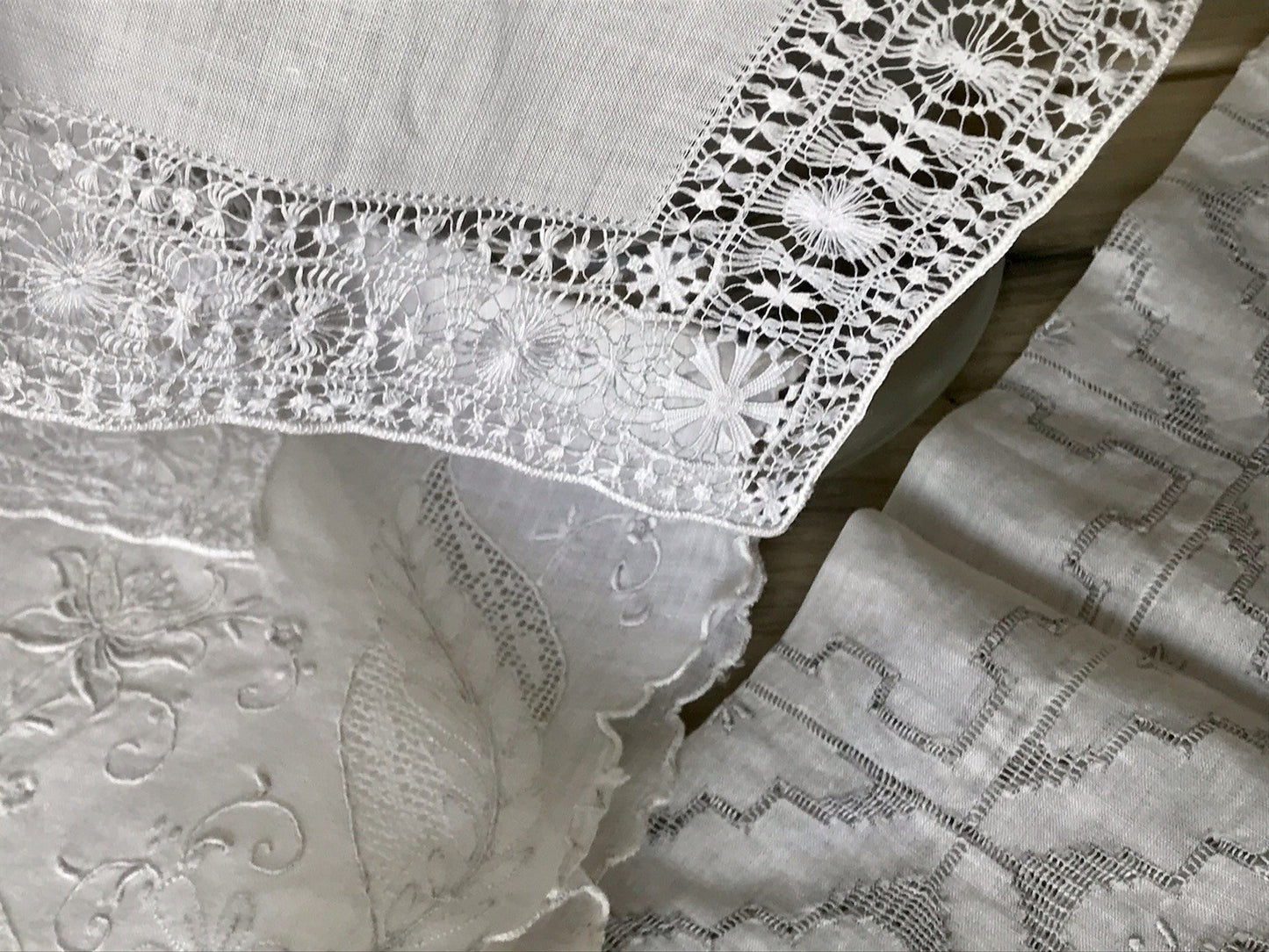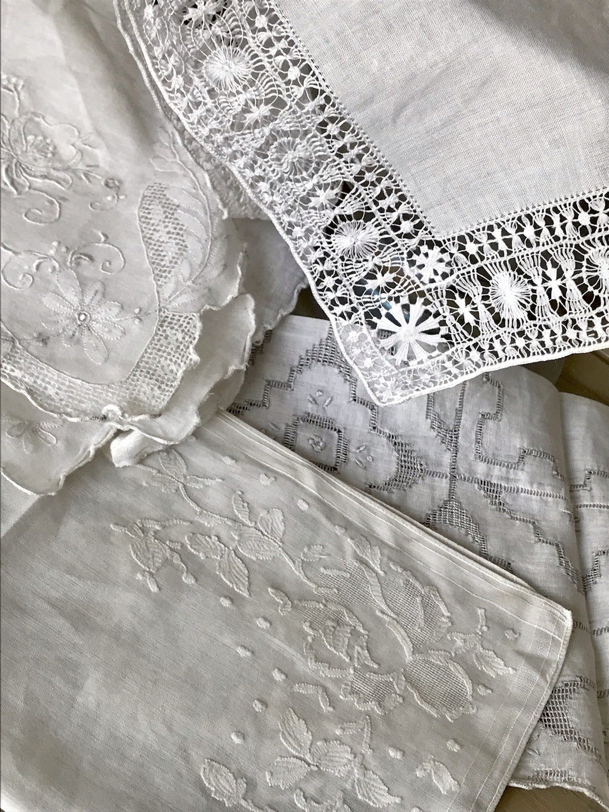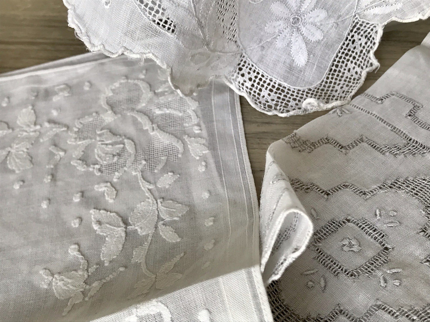 Antik 4x Taschentuch Taschentücher Stickerei weiß Batist Spitze elegant bestickt