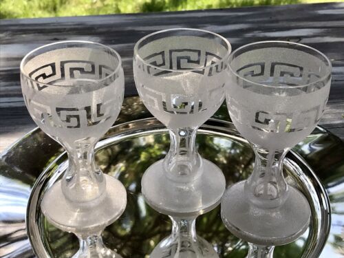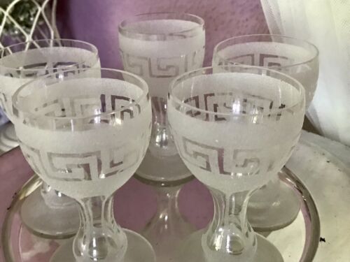 Kommodengriff präsentiert 5! antike Weingläser Fußbecher Pokalgläser Becher aus mundgeblasenen farblosem Glas mit wunderschönem geätzten Mäander-Muster der Kuppa und Schälschliff imitierendes Muster am nach innen konkaven Hohlschaft Schaft, der beim Befüllen mitbefüllt wird.