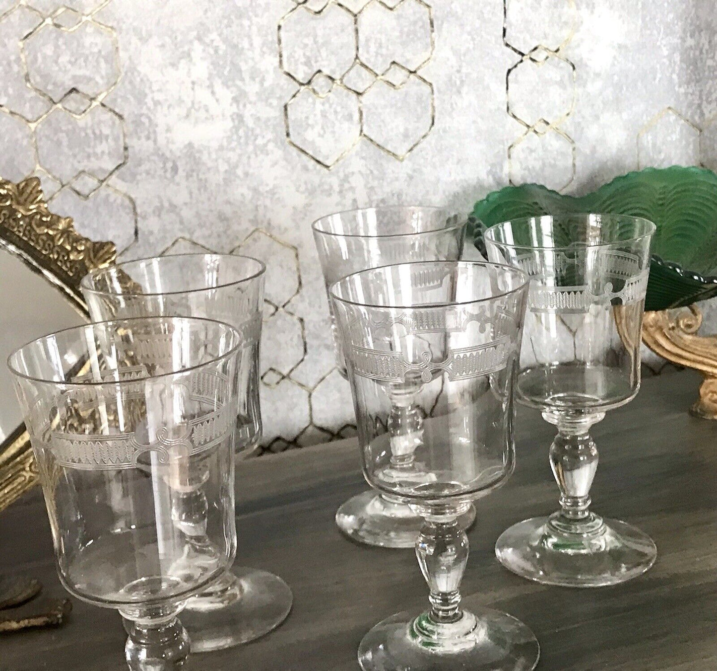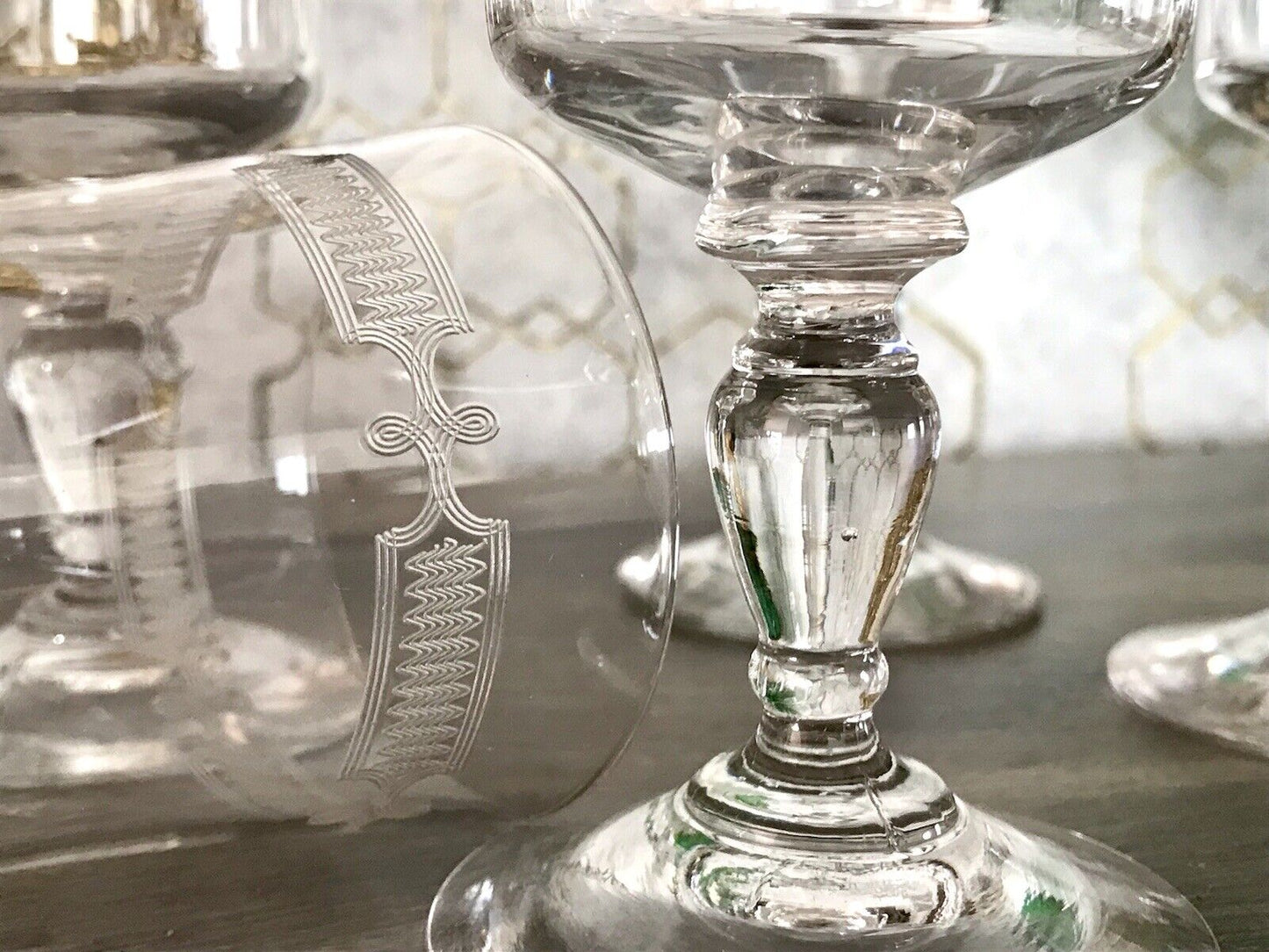 Kommodengriff präsentiert 5 wunderschöne alte antike Weingläser Gläser mit wundervoller einmalig schönen umlaufenden passigen geätzten bzw. guillochierten auffällig schönen Bordüre der Kuppa
