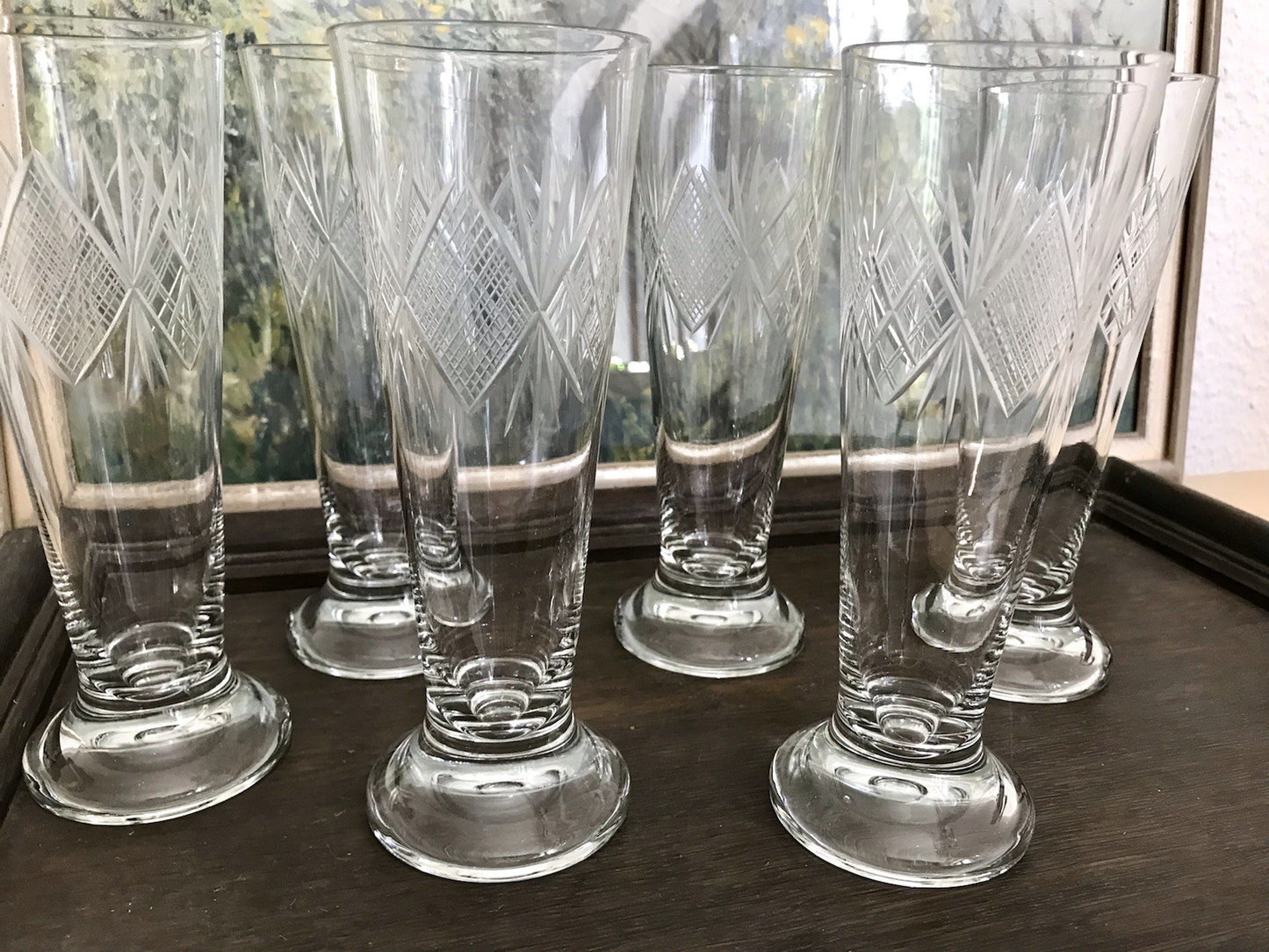 1 Glas eine Bestoßung am Fußrand unterseitig, aufgestellt fällt es wenig auf.