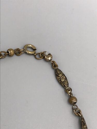 Einzelne ovale Perlenelemente der Kette mit floral stilisierten reliefierten Muster gearbeitet, dazwischen runde Metallperlen.