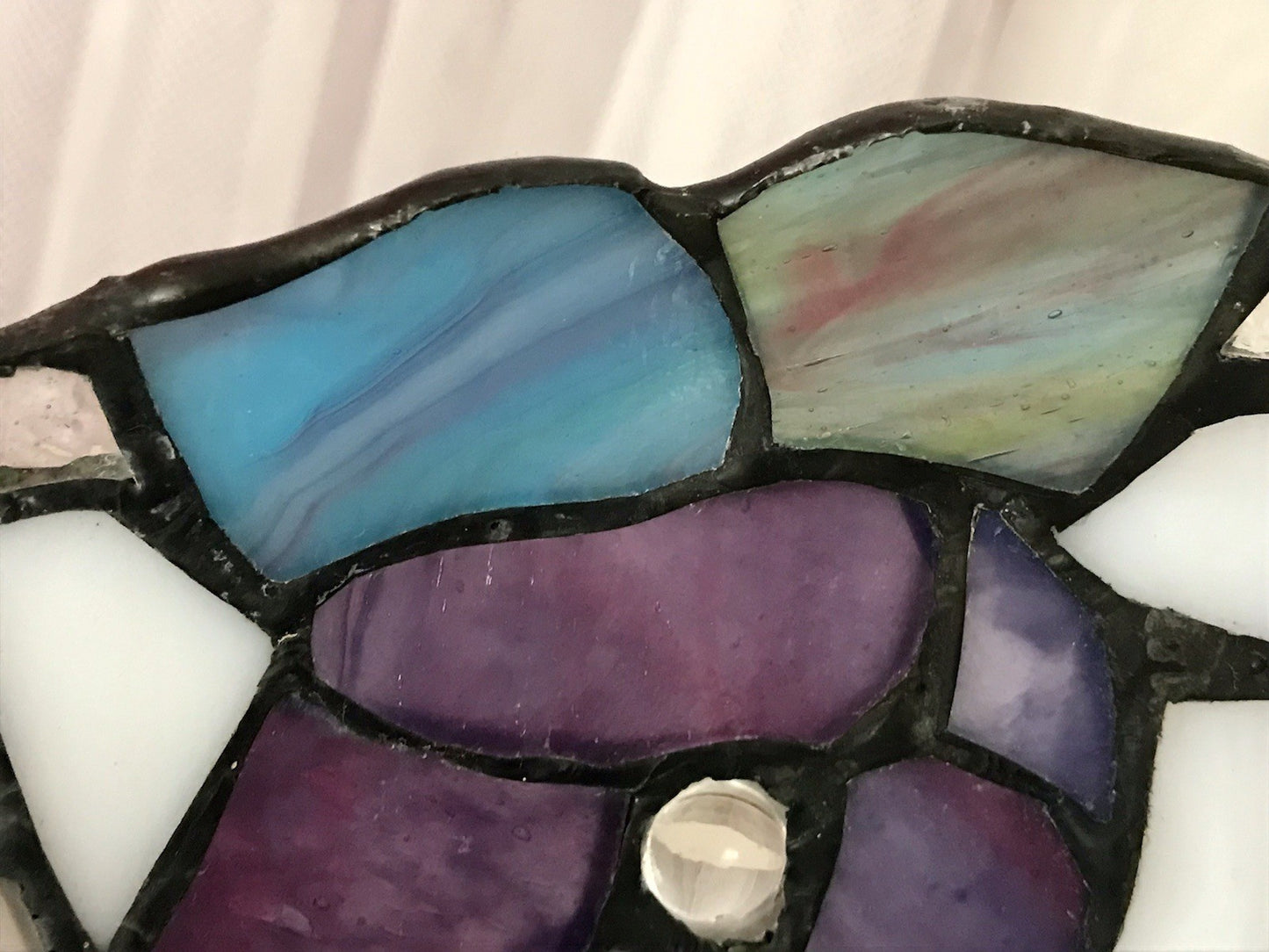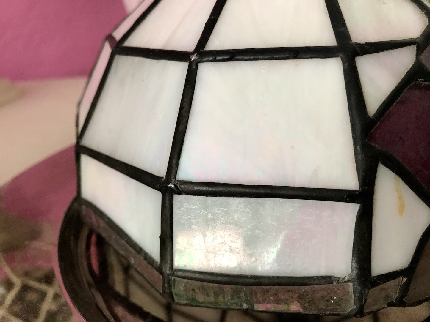 Mit Metall wohl Kupfer-Montur und mit weißlichem und lila irisierenden Glas zu einer Mosaik gelegt und gefasst.