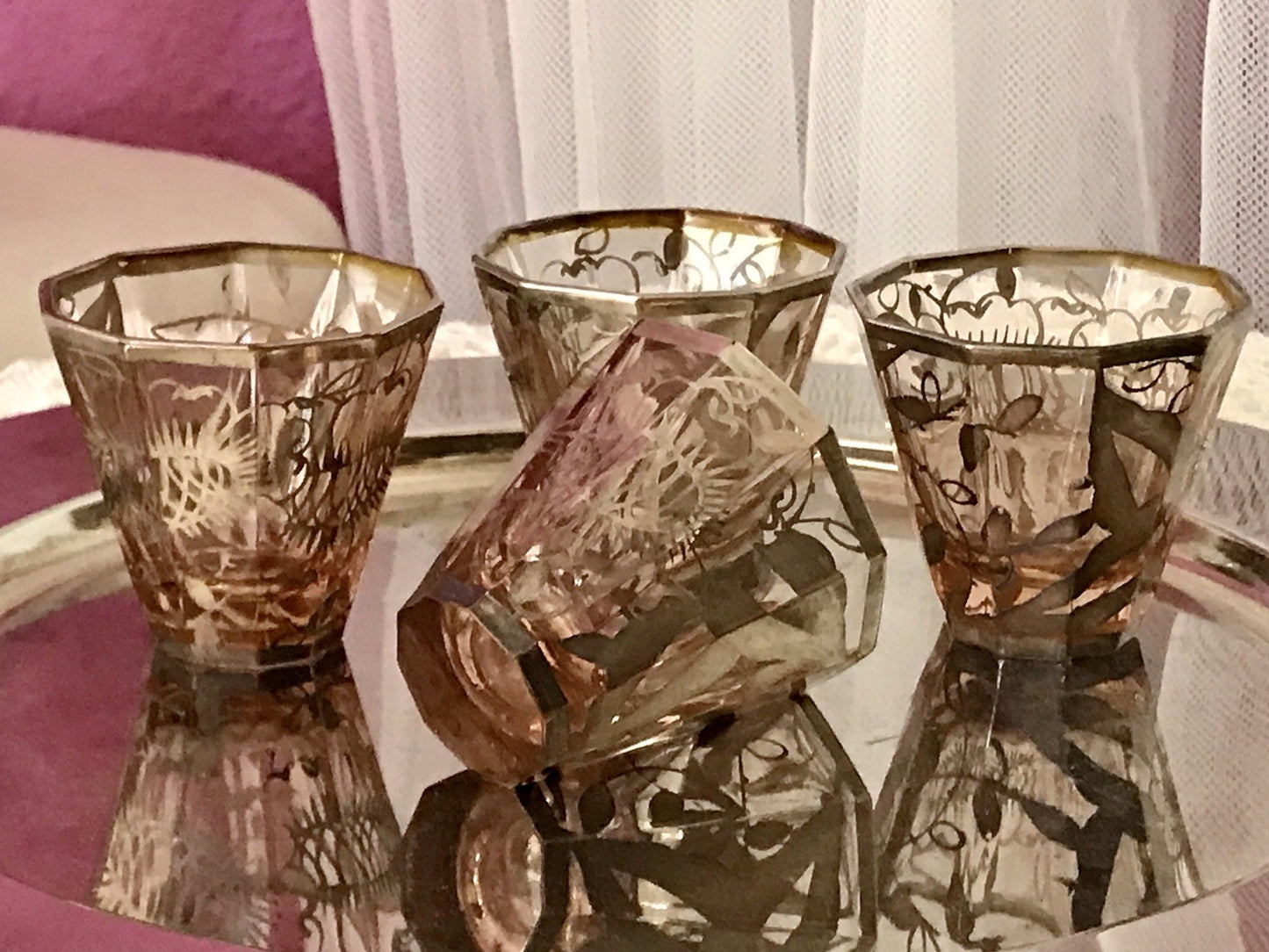 Antik ? Art Déco? 4 Likörgläser Schnapsgläser kantig Silberbeschichtung Böhmen?