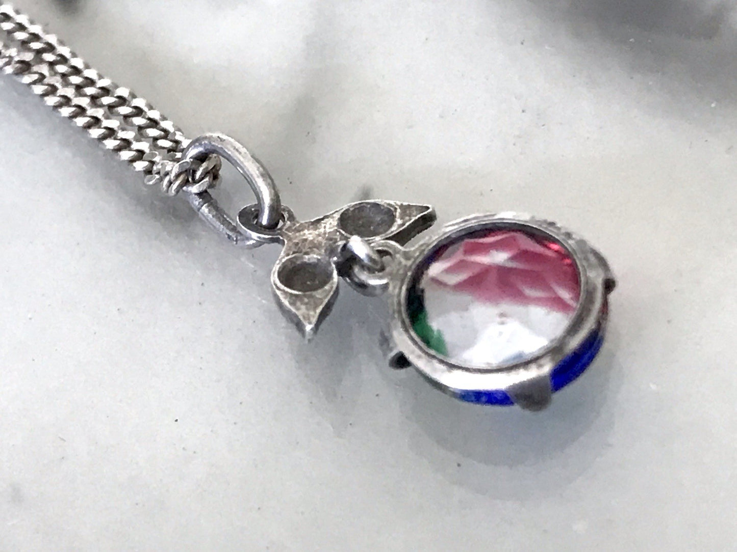 Der Anhänger ist nicht gepunzt, aber getestet und aus mindestens 800er Silber, Kette ist aus 925er Silber gefertigt und vermutlich jüngeren Datums.