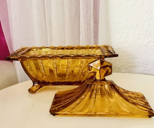 Wunderschön gearbeitete zauberhafte zum Verlieben schöne Dose Deckeldose Zierdose aus edlem tief bernsteingelbem Pressglas Glas besticht durch wunderschöne typische Art Déco-Form mit gezacktem reliefierten Rand, sowie einen wunderschönen Knauf.