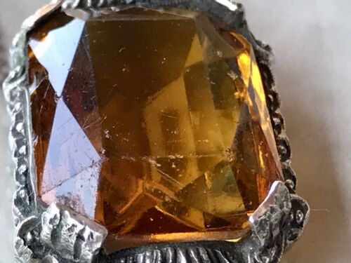 Sehr schönes atemberaubendes ausgefallenes wundervolles typisches Art Déco Design, gefasst mit einem wundervollen in Scherenschnitt geschliffenen achteckigen in Krallenfassung gefassten topas gelbem Stein, Näheres unbekannt, um was es sich hierbei handelt.