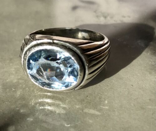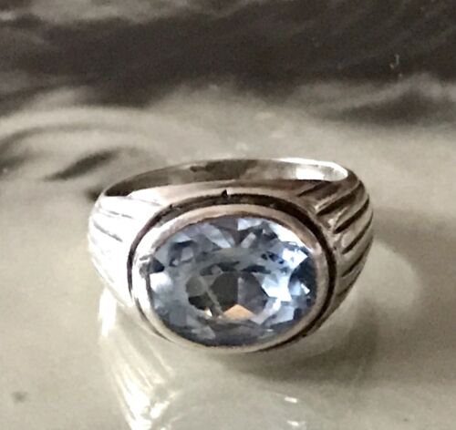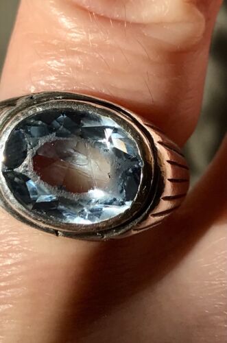 Sehr schönes elegantes wundervolles geschmackvolles und aussagestarkes Design mit halbhochrundem wundervoll gearbeiteten Ringkopf mit in Zargenfassung gefassten geschliffenen funkelnden blauen Stein vielleicht Aquamarin??