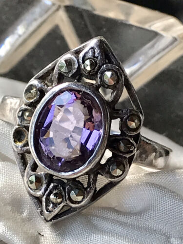 1 herrlichen zauberhaften und eleganten edlen antiken Silber-Ring Silberring Damenring mit schönen lilafarbenen geschliffenen wohl Amethysten und Markasiten