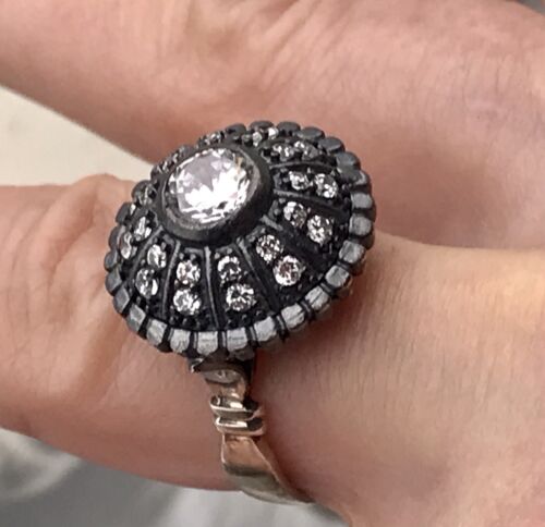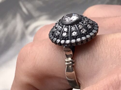 Kommodengriff präsentiert einen edlen zauberhaften vermutlich antiken wundervoll ausgeformten prächtigen Art Déco Silberring Damenring besetzt mit vielen farblosen Steinen in Gr.56/57 Durchmesser innen etwas zwischen 17,8-1,81