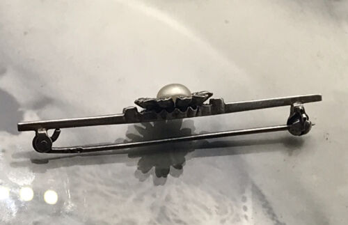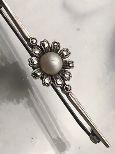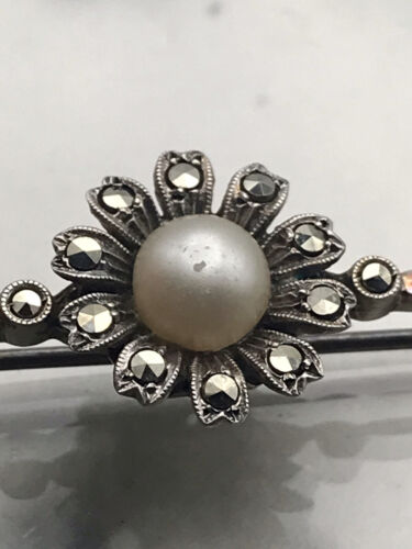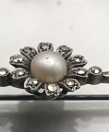 Kommodengriff präsentiert eine edle zauberhafte antike sehr geschmackvolle Silber-Brosche Stabbrosche mit Markasiten und 1 Perle (vermutlich Kunstperle) besetzt