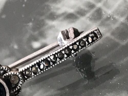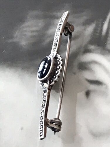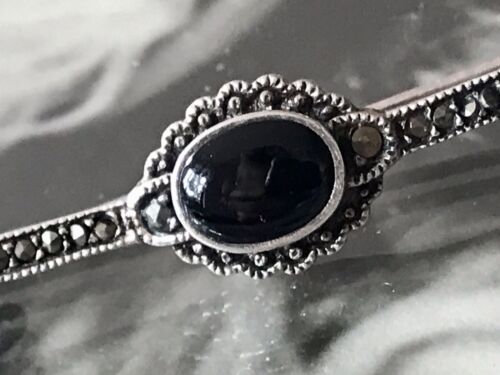 Kommodengriff präsentiert eine edle zauberhafte antike sehr geschmackvolle Silber-Brosche Stabbrosche mit Onyx&Markasiten besetzt