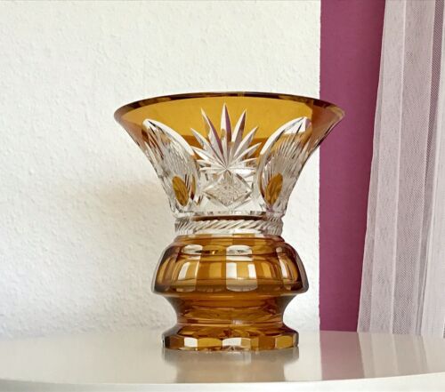 Wunderschön gearbeitete zauberhafte zum Verlieben edle umwerfend schöne elegante recht große Glasvase aus edlem Kristallglas Überfangglas in bernsteingelber Farbe.