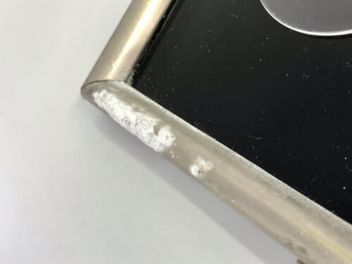 Hergestellt aus Holz, Glas und verchromtem Rahmen.