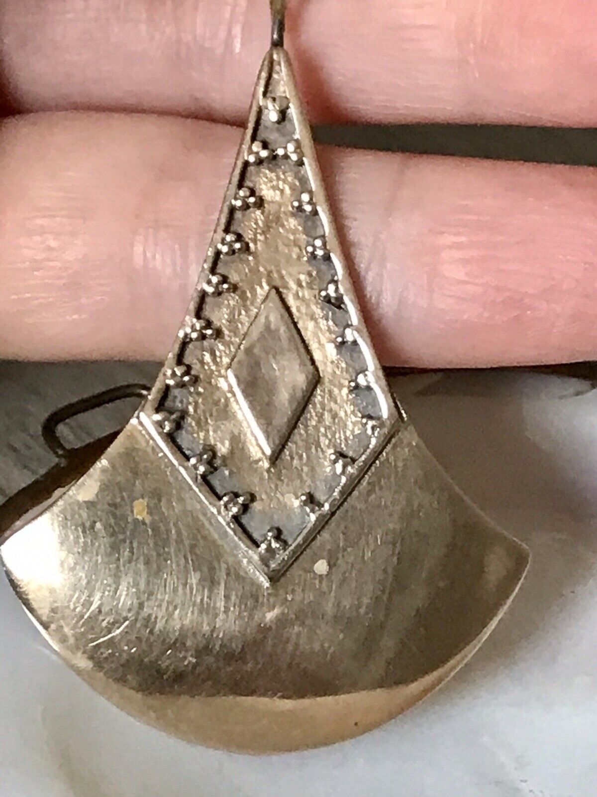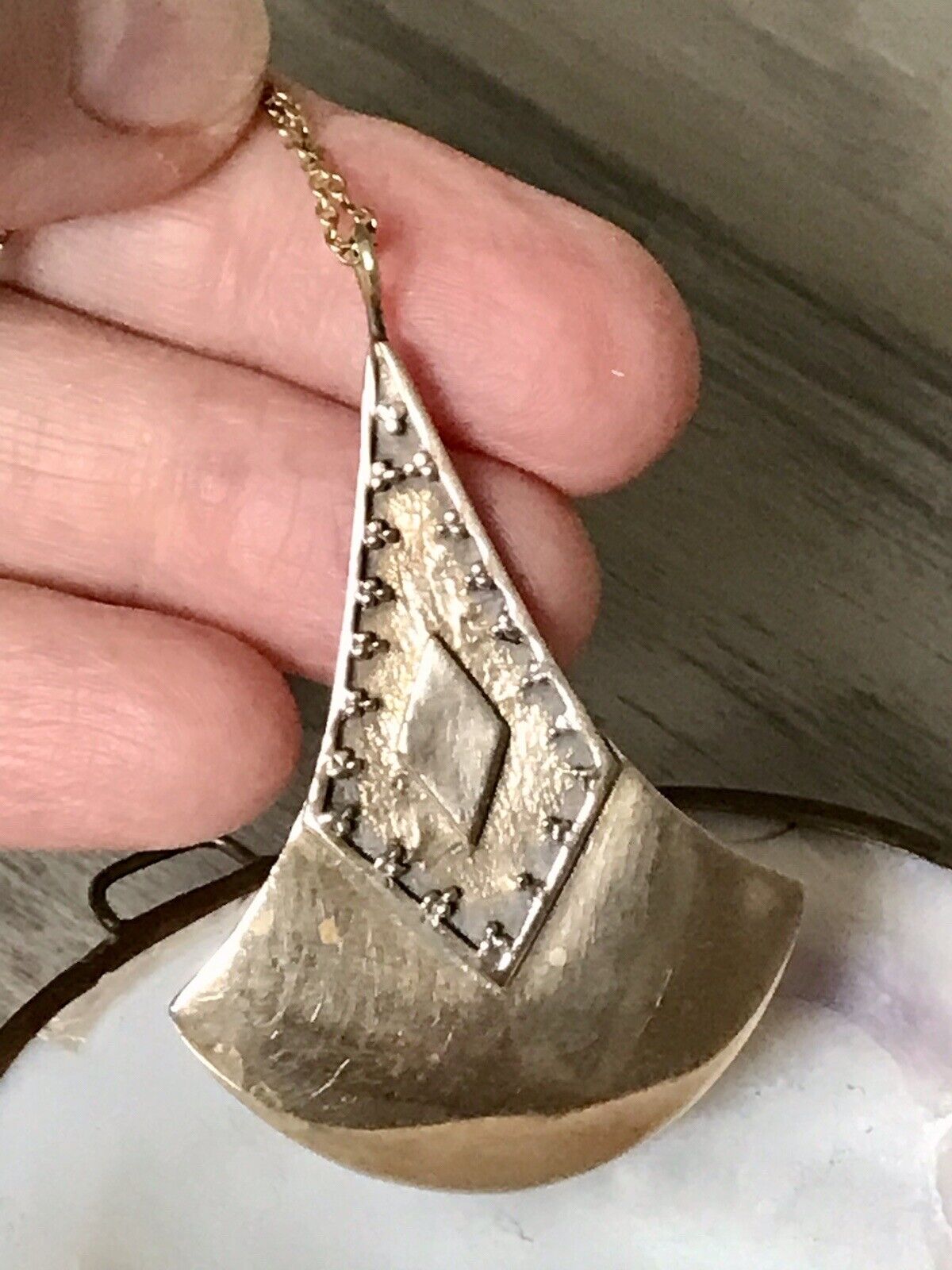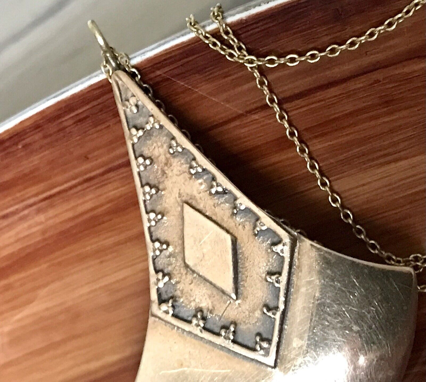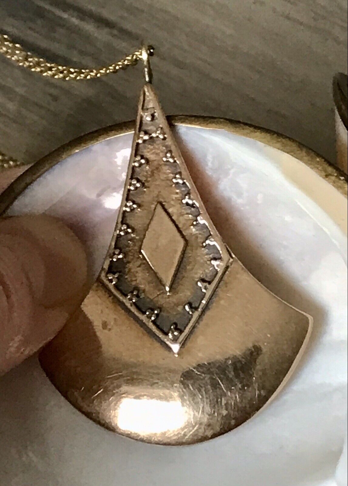 Wunderschöner vergoldeter Anhänger ist im Bereich des spitzen Ecke (darunter genau genommen) rautenförmig und auch mit rautenförmigem fein reliefierten Muster gearbeitet.