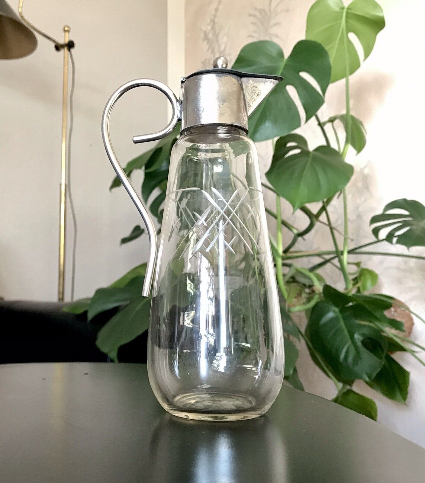 Antik Art Déco Karaffe Dekanter Metallmontur Glas geschliffen